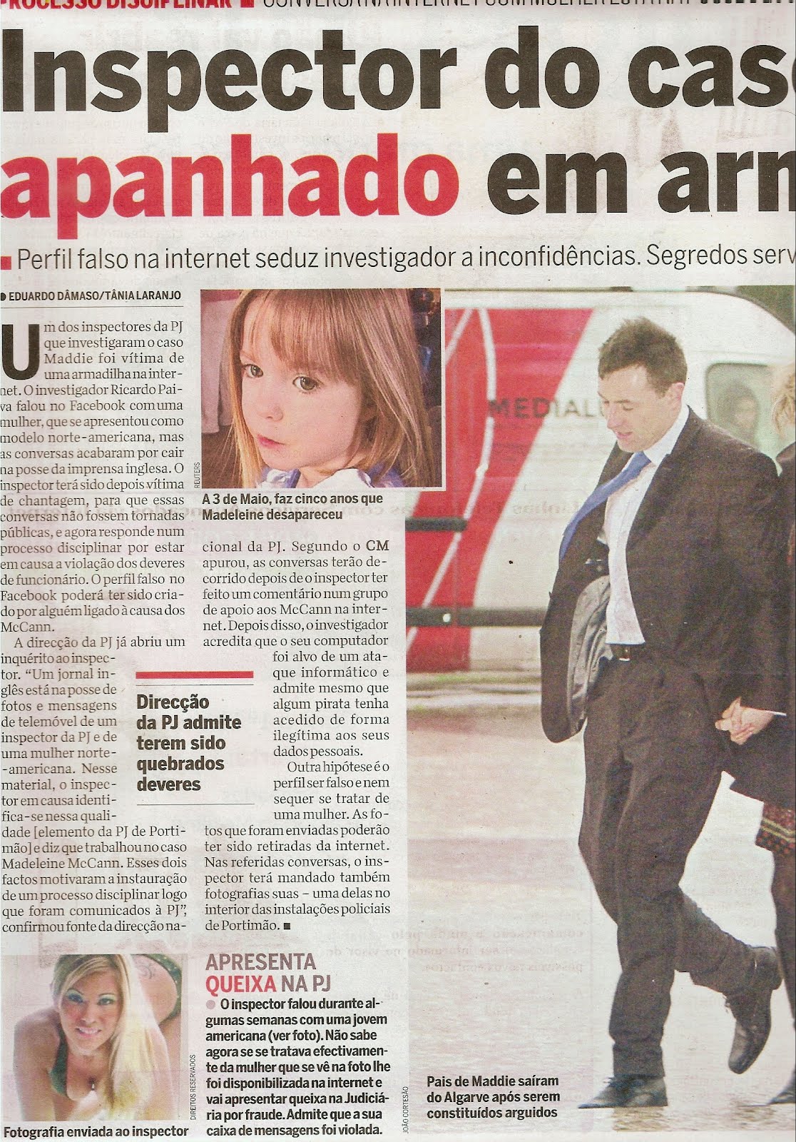 One of the PJ inspectors who investigated the Maddie case was the victim of a trap on the Internet. The inspector Ricardo Paiva [the McCanns' liaison officer during the investigation] spoke on Facebook with a woman who introduced herself as an American model, but the talks eventually ended up in the possession of the English media. The inspector was blackmailed, so these conversations were not made public, and now is facing a disciplinary process concerning the breach of civil servant duty. The fake profile on Facebook may have been created by someone connected to the McCanns' cause.